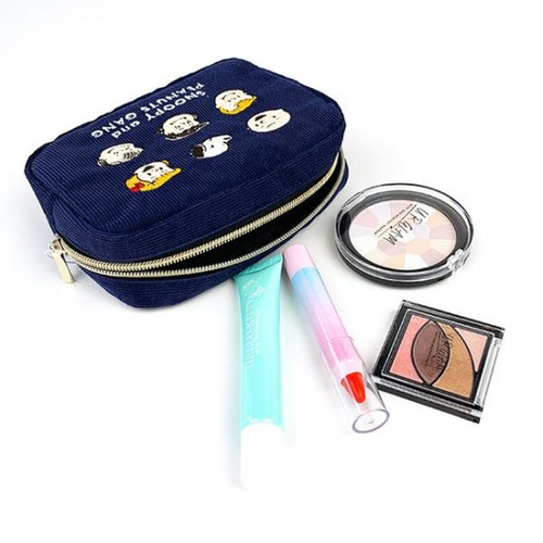 スヌーピーとフレンズのお顔が並んだ、キュートなデザインのポーチです。ネイビーのコーデュロイ素材は、この季節にはピッタリですよね。