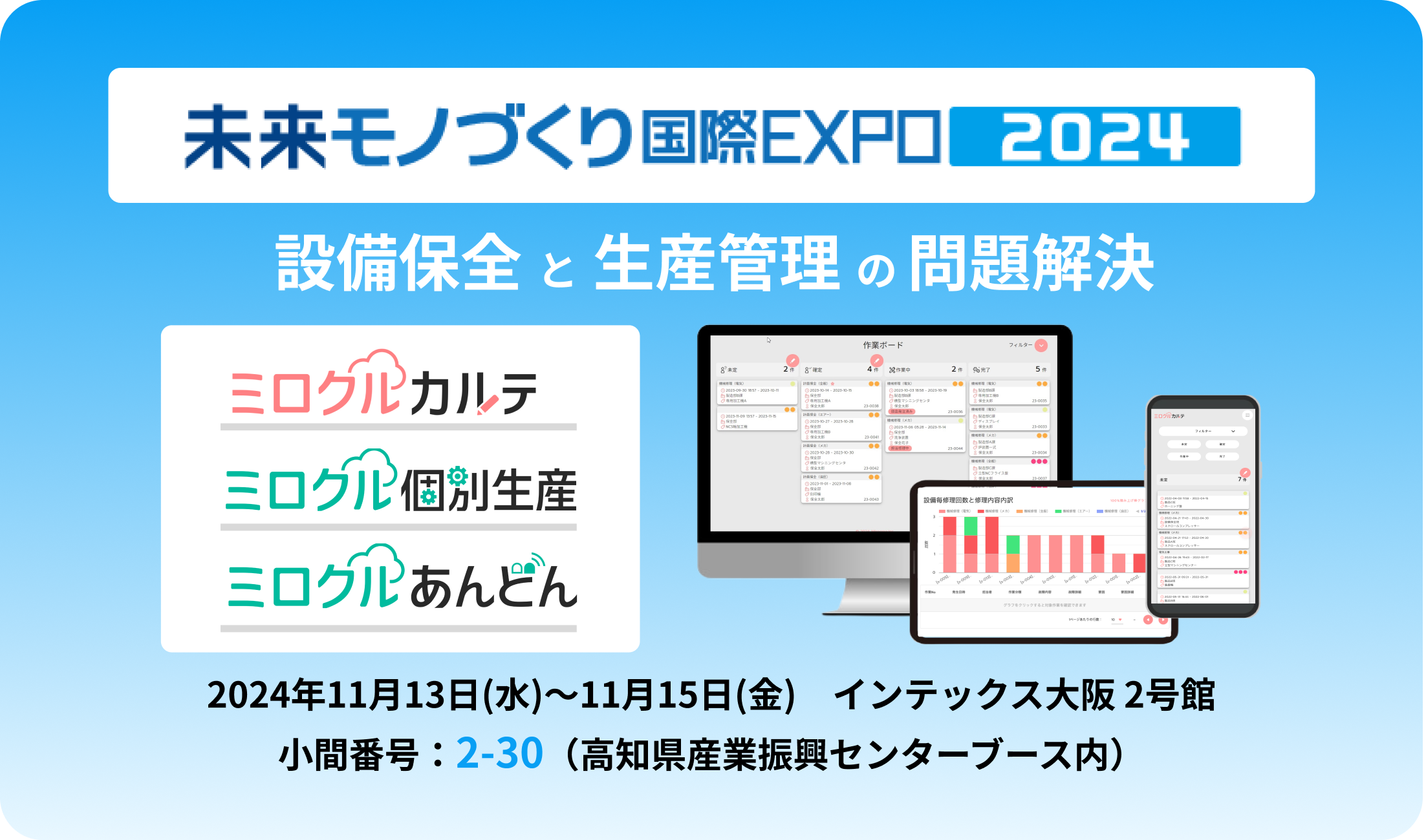 この度、2024年11月13日(水)~15日(金)にインテックス大阪で開催される「未来モノづくり国際EXPO2024」において、設備保全業務の効率化・分析ツール「ミロクルカルテ」、多品種少量生産に特化した生産管理ツール「ミロクル個別生産」、およびロット生産向け生産進捗ツール「ミロクルあんどん」の3サービスを同時出展いたします。最新の機能と活用事例をご紹介いたしますので、お気軽にお立ち寄りください。