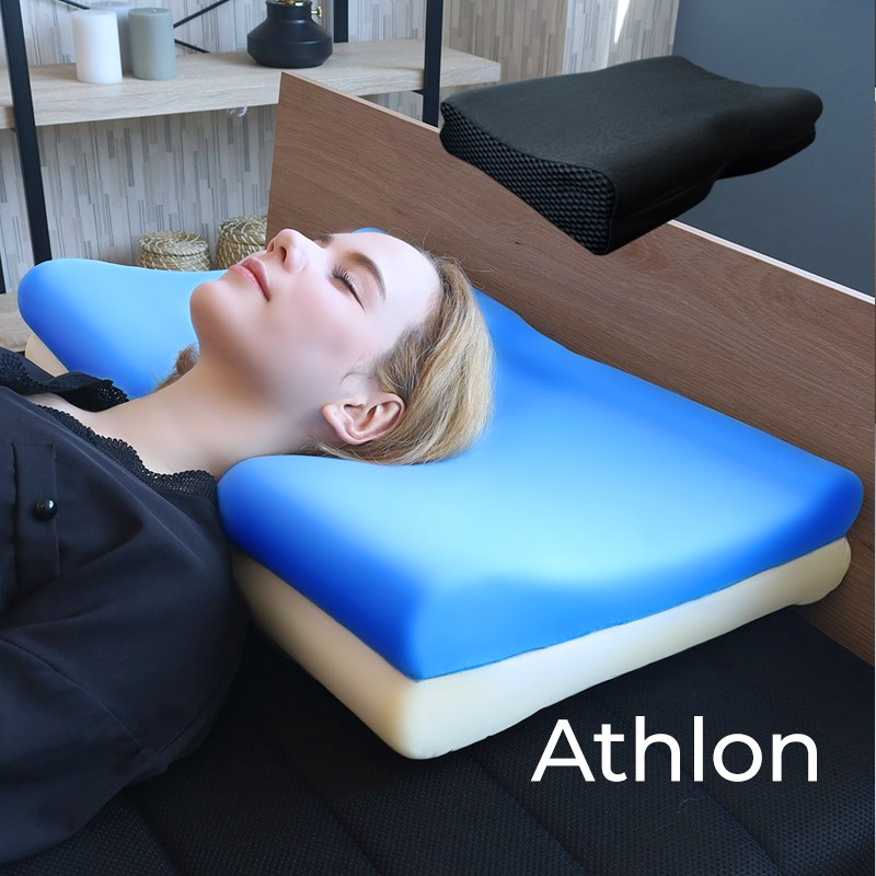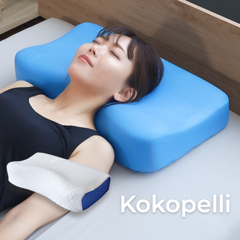 首・肩に沿う湾曲ラインで隙間を埋めてフィットする頸椎安定ピロー。頸椎を支える傾斜と盛り上がった形状のネックアーチで首をストレッチ。横向き寝もしやすい形状です。