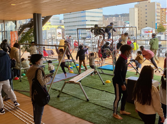 「共育・共遊・夢中力」をテーマに、新山口駅南口構内に敷かれた芝生の上に、子どもだけでなく大人も夢中になれる遊具いっぱいのプレーパークを展開します。楽しいアクティビティがもりだくさん!全力で“遊ぶ”を楽しもう!!