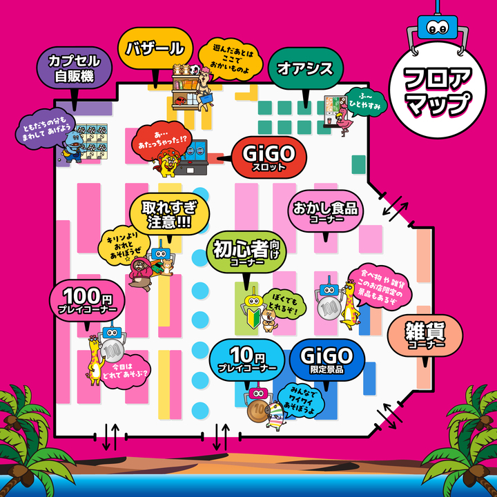 ファミリーで安心して遊べる“10円プレイコーナー”や、“初心者向けコーナー”、さらに「取れる」体験を最優先したコーナーなど、家族みんなで楽しめる豊富なバリエーションのクレーンゲームが満載です。さらに、プレイ後に機械から出てくるチケットを集めてお菓子などに交換する“バザール”や、遊び疲れた時に一息入れられる休憩スペース、無料ドリンクコーナー(GiGOアプリ会員限定)も備えています。手軽に時間を気にすることなく、「家族みんなで一日中楽しめる」同店は、GiGO地域最大級の滞在型で楽しめるクレーンゲームの“オアシス”となっております。