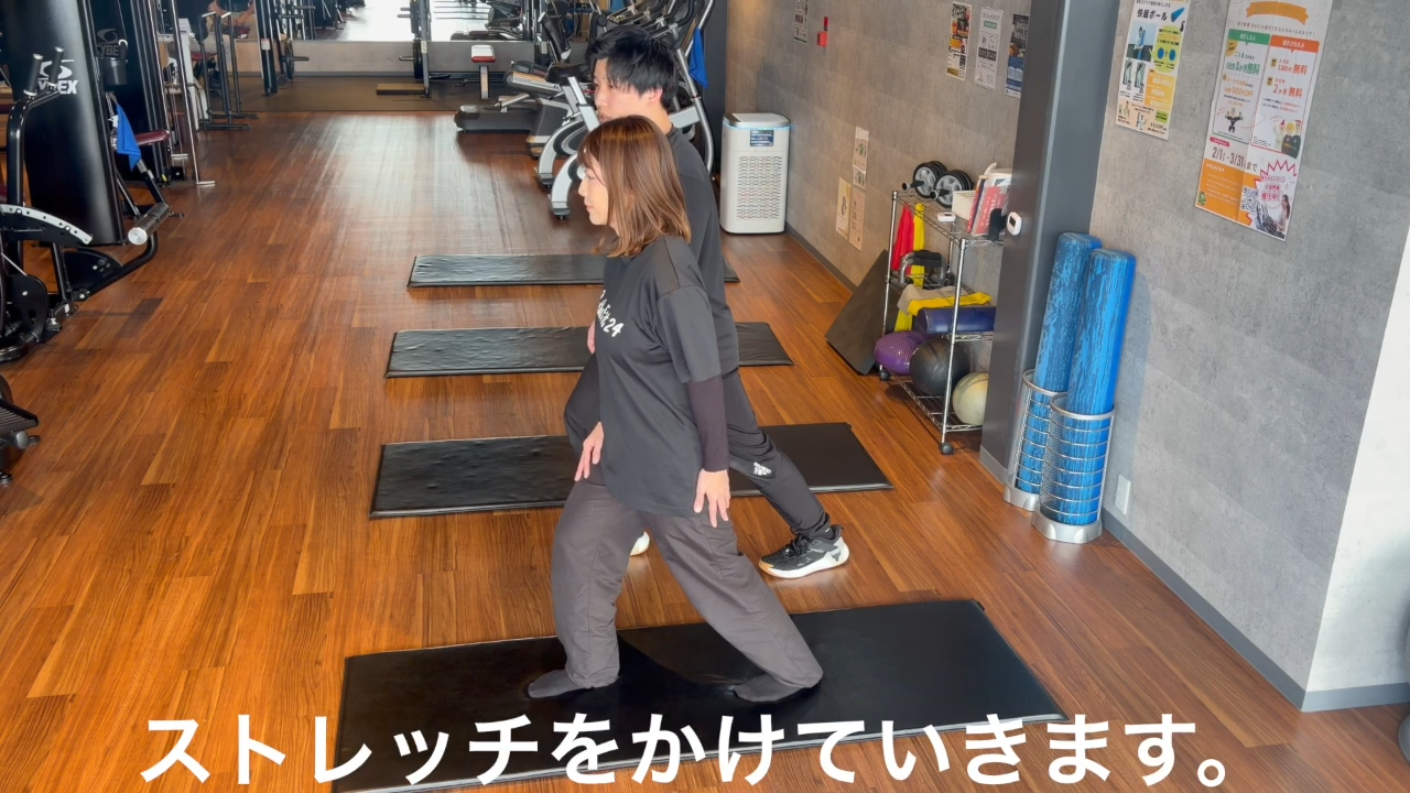 足を前後に開き、前の足の膝を軽く曲げます。後ろ足のかかとを床につけたまま、体重を前にかけることでふくらはぎを伸ばします。