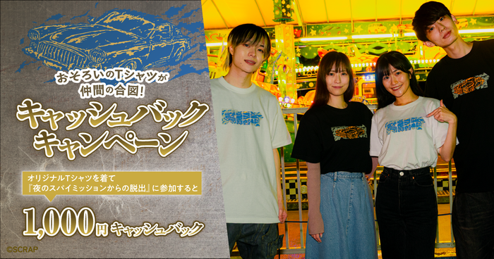 ※SCRAP GOODS SHOP(通販)、リアル脱出ゲーム店舗にて、『夜のスパイミッションからの脱出』オリジナルTシャツを事前購入された方へキャッシュバッククーポンを配布いたします。