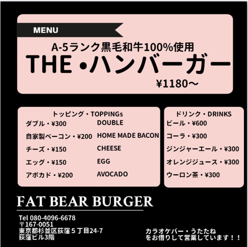 「FAT BEAR BURGER」で、最高級の黒毛和牛バーガーをぜひお楽しみください。