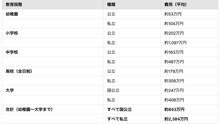 子どもが幼稚園から大学を卒業するまでにかかる学習費用は、すべて国公立で約840万円、すべて私立の場合は約2,300万円 にのぼります。(文部科学省調べ)
