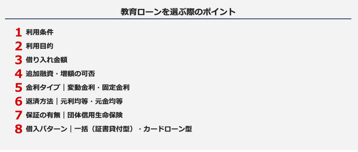 教育ローンを選ぶ際には、以下の8つのポイントを確認することが重要です。