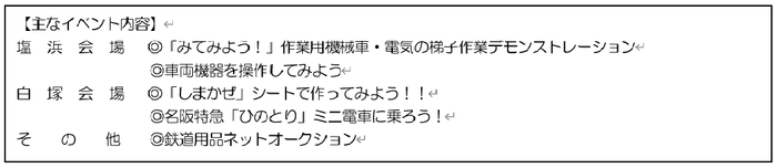 今回は、より多くのイベントをお客さまに楽しんでいただけるよう、今までの塩浜会場(三重県四日市市:塩浜検修車庫)に加えて、白塚会場(三重県津市:白塚車庫、白塚体育館、白塚グラウンド)でも初めて開催します。これにあわせて両会場を結ぶ近鉄四日市駅~白塚駅間で臨時列車の運転と塩浜駅~津新町駅間で普通列車の区間延長運転を行います。