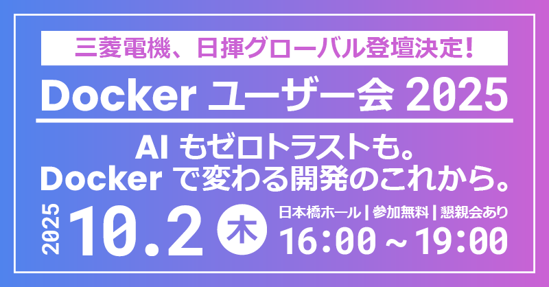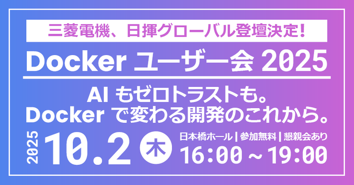 三菱電機、日揮グローバル登壇決定! エクセルソフトは、企業向け Docker ユーザー会 「AI もセキュリティも。Docker で変わる開発のこれから。」 を10月 2日 (木) に日本橋ホールで開催