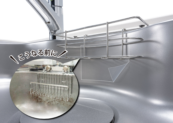 シンク側面の落としにくい汚れの防止と衛生対策に着目。シンク側面にシートを貼っておくことで、お掃除がしにくい箇所の水垢汚れやカビを、シートを剥がすだけで簡単に除去できます。