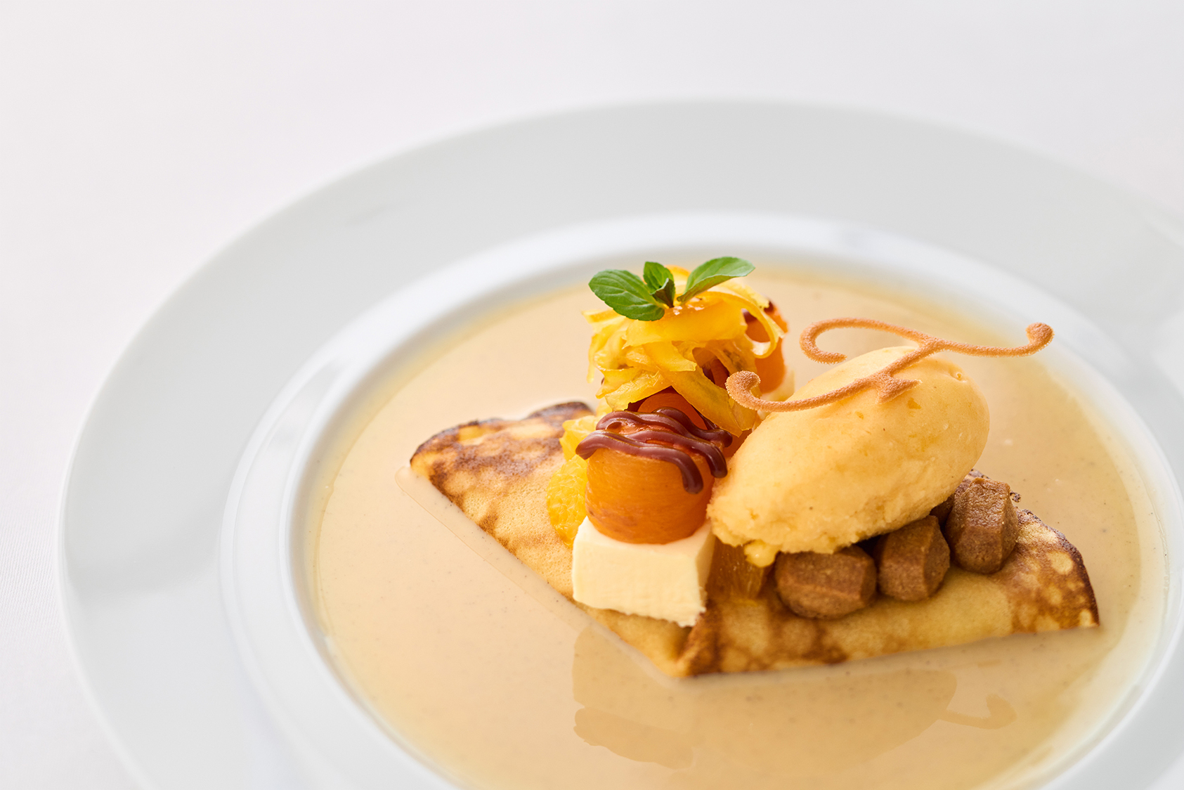 あんぽ柿の自然な甘みを生かし、あんぽ柿とオレンジのコンフィチュールをクレープで包み込み、その上に、あんぽ柿と相性の良いクリームチーズのムースと、果実味豊かなあんぽ柿のソルベを添えました。