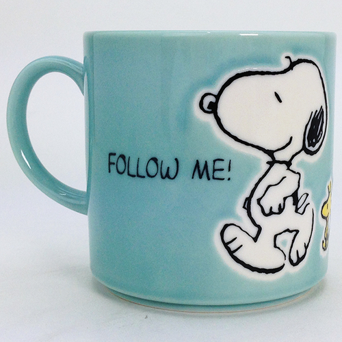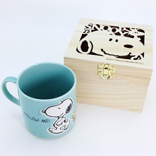 お次は、木箱入りのマグカップです。高級感ありますね~。マグカップにはウッドストックとお散歩中のスヌーピー。ブルーグリーンの絶妙なカラーもオシャレですよね。