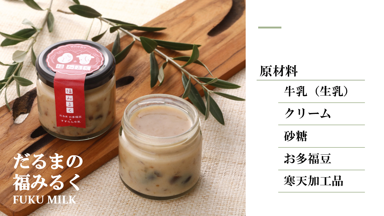 伝統製法のお多福豆と、駒ヶ根高原すずらん牛乳からつくられる【福みるく】は、無添加・濃厚仕立てのミルクジャム。豆のやさしい甘さとミルクのコクが溶け合った、子どもにも安心な自然派スイーツ。パンやスイーツ、ドリンクなど幅広く楽しめる、“甘いのに罪悪感のない”新しい間食スタイルです。