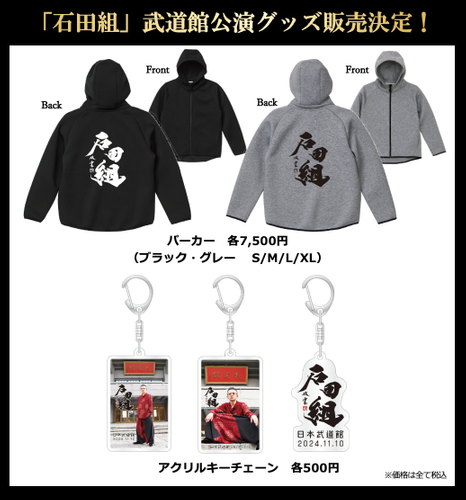 『石田組』のロゴが背面にデザインされたパーカーと、アクリルキーチェーンの2アイテムを販売。