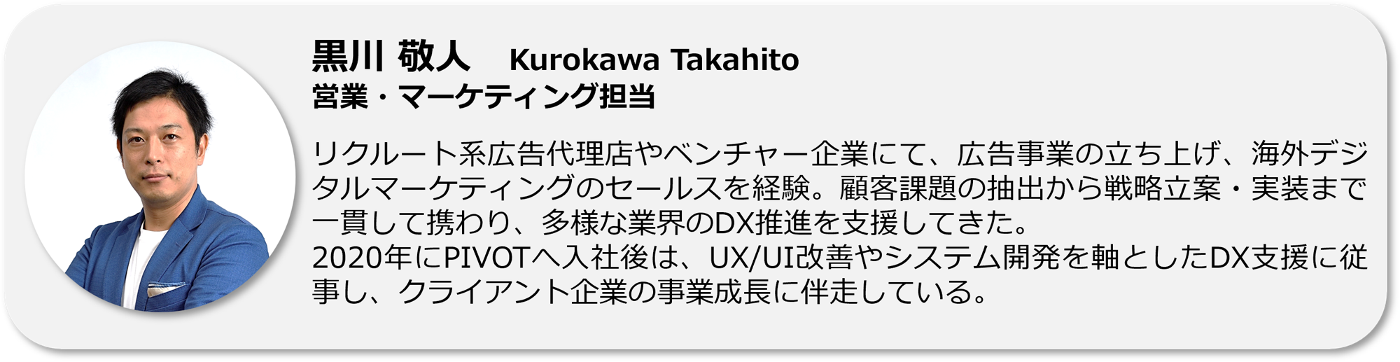 株式会社PIVOT(https://pivot.jp/)は「ユーザーの最高体験」を追及、WEBサイト制作、アプリ開発、システム開発のUXデザイン、UI改善、企画から実装、運用に至るまでワンストップでサポートさせていただいております。