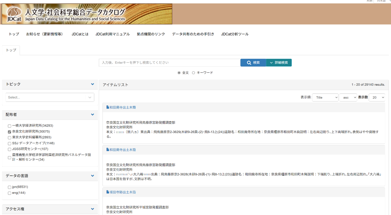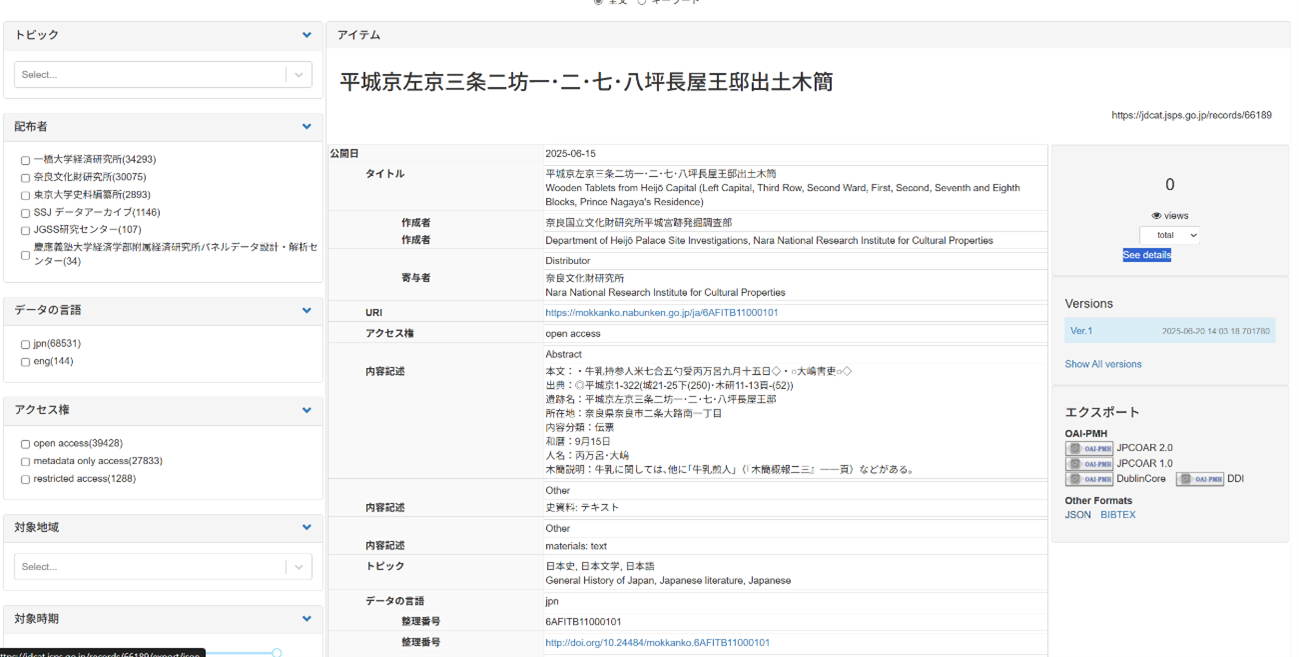 その事業の一環として2025年6月26日、奈良文化財研究所が運用している木簡庫データのメタデータ30,075件がJDCatに公開されました。