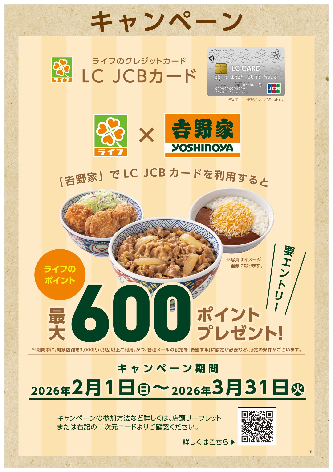「吉野家」で「LC JCBカード」をご利用いただくと、 いつもよりもっとお得にライフのポイントがたまる! 特別なキャンペーンを2月1日から3月31日まで開催
