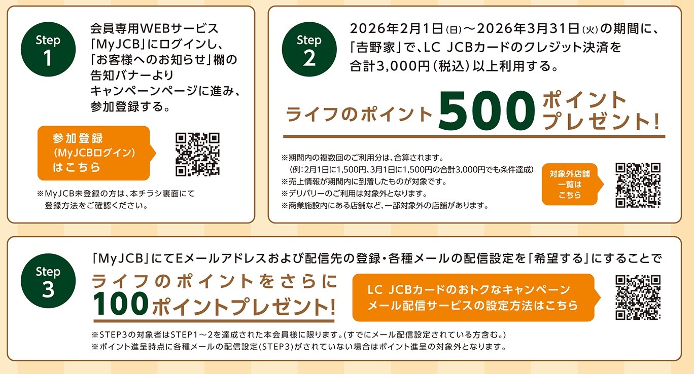 キャンペーンのご参加には会員専用WEBサービス「My JCB」からのエントリーなど、所定の条件がございます。ライフで使えるポイントがたまるお得な機会に、ぜひ「吉野家」でのお食事をお楽しみください。