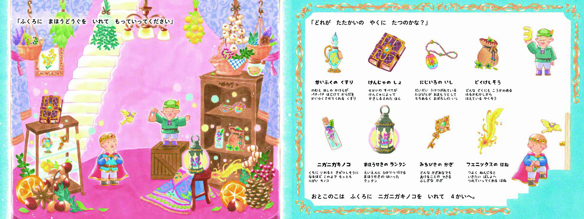 各ページに細かく描きこまれたアイテム選びで、読み聞かせをしながら会話もひろがります