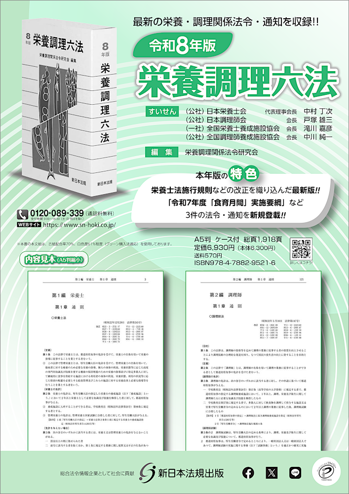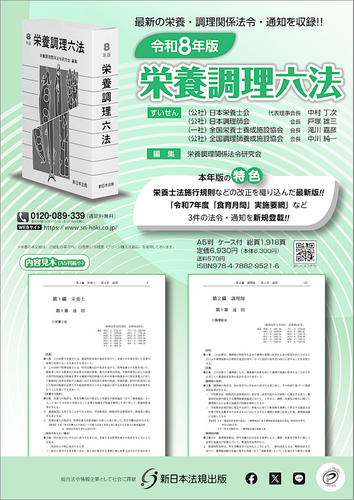新日本法規出版株式会社(所在地:愛知県名古屋市中区、代表取締役社長:河合誠一郎)は、新刊『栄養調理六法 令和8年版』を2025年9月16日(火)に発売いたしました!