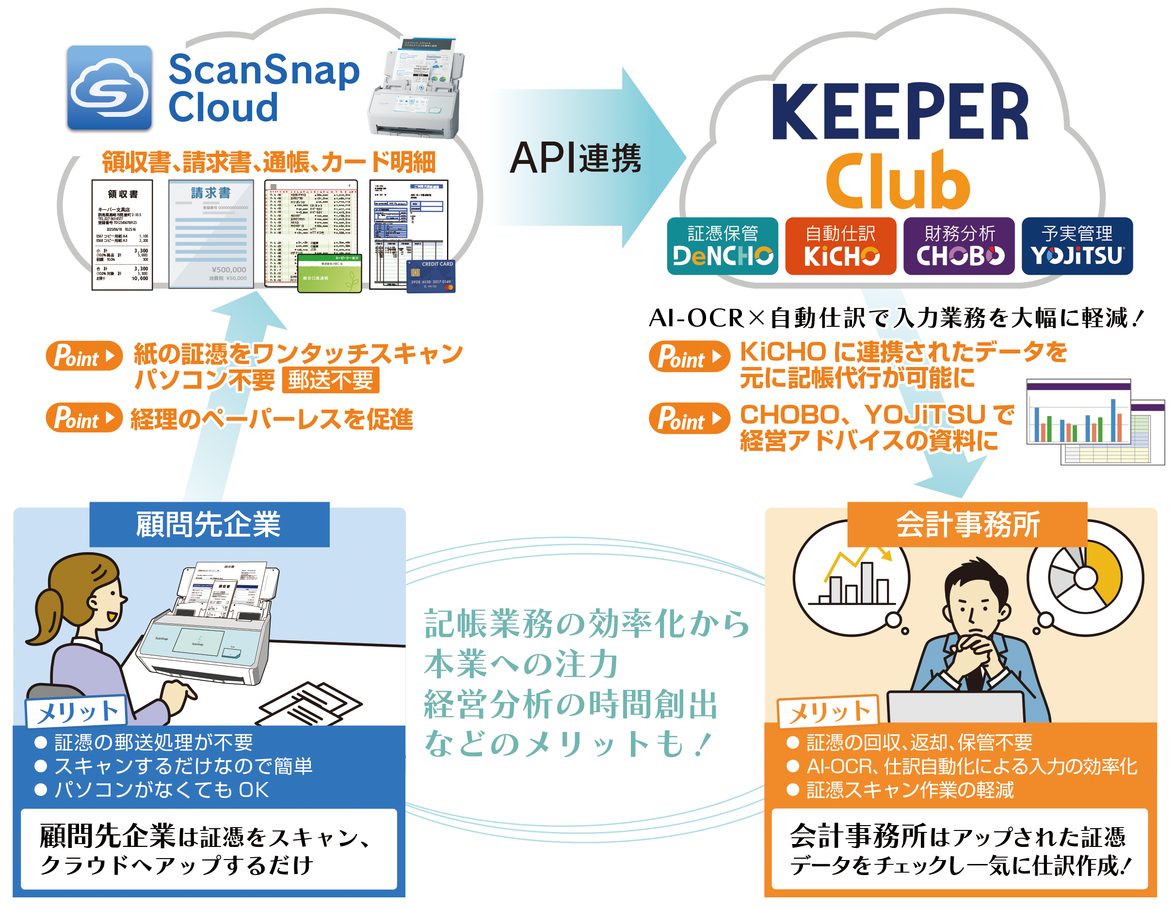 今回の連携で、ScanSnapでスキャンしたレシート、領収書、請求書、通帳、クレジットカード明細のデータはインターネット経由でKEEPER Clubのクラウド自動仕訳「KiCHO」に保存されます。保存された証憑の画像データはAI-OCRを利用し自動で仕訳作成までできるのでペーパーレス化、大幅な業務効率化となります。
