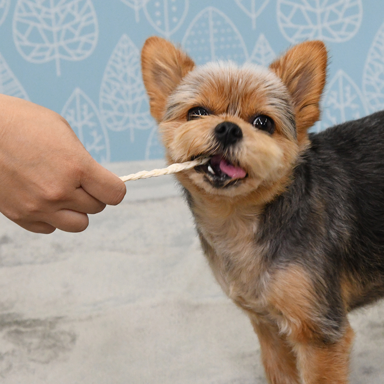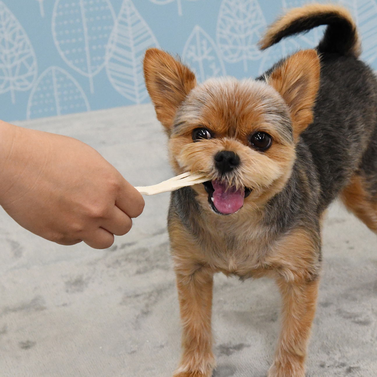 歯みがきガムを効果的に使用するためには、ただ与えるだけではなく、人が手で持ってサポートすることが有効です。歯全体で長く・よく噛めるよう、持ちやすいサイズとしなやかな弾力ある食感に仕上げました。噛む力が弱いコも噛みやすい、超小型犬向き。