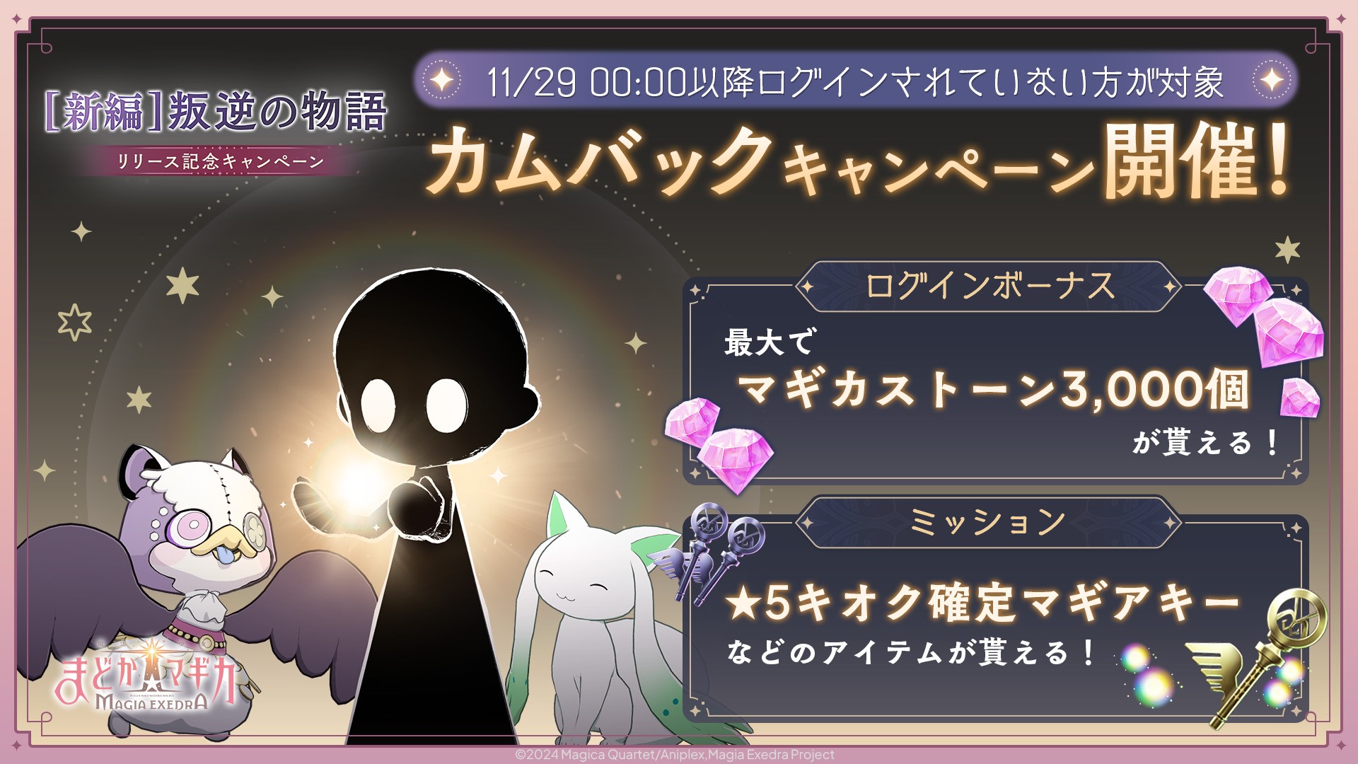 対象となるユーザーは、期間中毎日ログインすることで、最大でマギカストーン3,000個がもらえます。さらに、カムバックミッションをクリアすることで、「★5キオク確定マギアキー」や「マギアキー」30個などがもらえます。