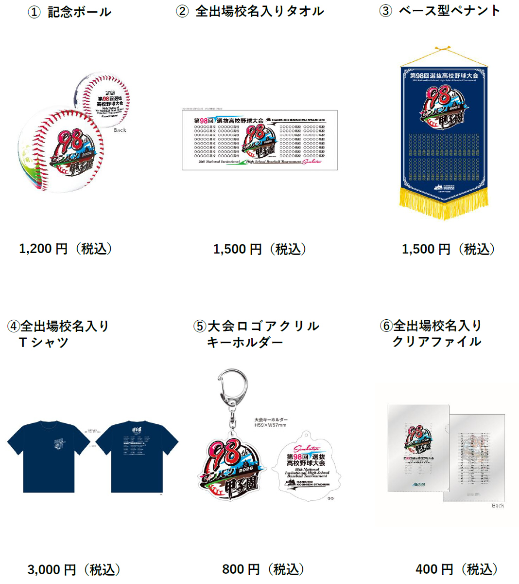 また、同時に第98回選抜高等学校野球大会グッズも発売します!大会ロゴのほか、全出場校名入りのものもありますので、記念に是非お求めください。