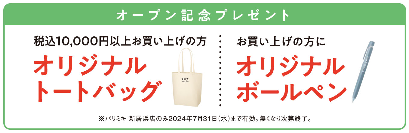 オープンを記念し、税込10,000円以上お買い上げの方に「オリジナルトートバッグ」を、また、期間中お買い上げの方に「オリジナルボールペン」をプレゼント!