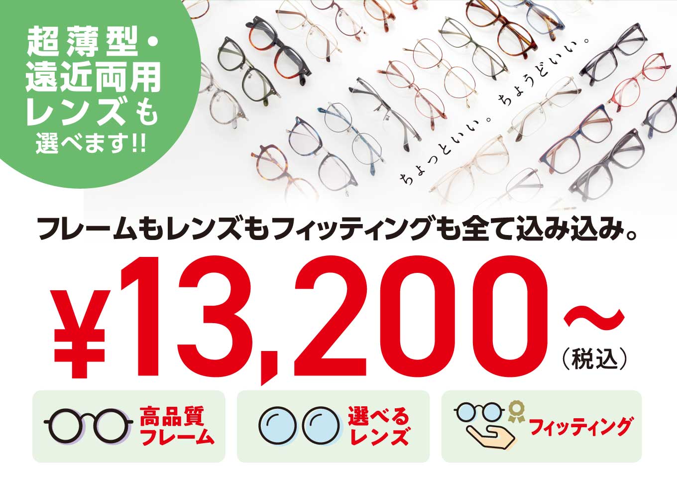 高品質フレームに選べるレンズが付いて税込\13,200~、超薄型・遠近両用レンズをはじめ、パソコン・スマホなど比較的近くの距離が見やすい中近両用レンズ・近々両用レンズも追加料金なしで選べます。