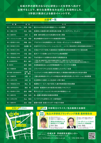 本学は 2023 年1月11日(水)、「名城大学リサーチフェア2022」をウインクあいちで開催します。本学の研究力と研究シーズを広く社会に発信し、共同研究など産官学連携のきっかけづくりを目的とするイベントです。