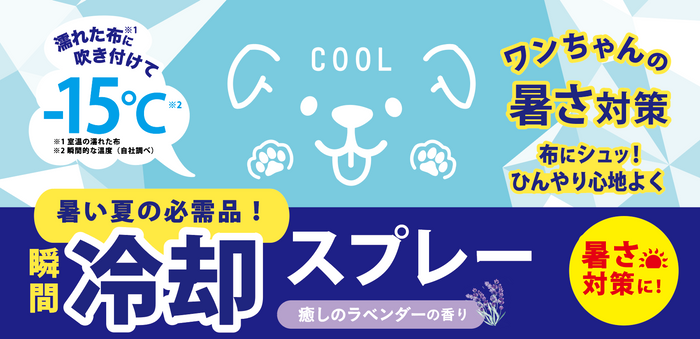 わんちゃんを暑さから守るアイテムとして、「わんちゃん用どこでも冷却スプレー」を発売することになりました。濡れた布などにスプレーを吹きかけると瞬時に布が凍り、氷おしぼりをすぐに作ることができます。凍った布でわんちゃんの体を冷やしてあげることで、体温調整の手助けとなります。スプレーの良いところは、わんちゃんのクッションなど大きなものにも使えることや、お出かけ先でも使えることです。氷おしぼりを作っても、外出先で溶けてしまうとぬるくなってしまいますが、スプレーを持ち運べばその場で凍りおしぼりを作ってあげることができます。夏のお出かけやお散歩にお役立てください。