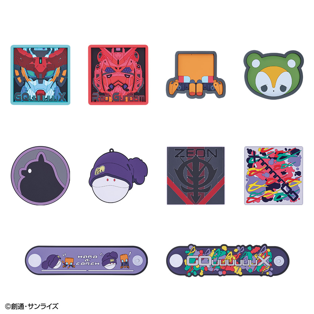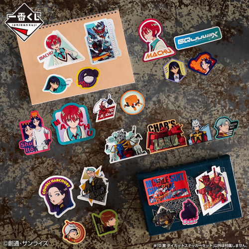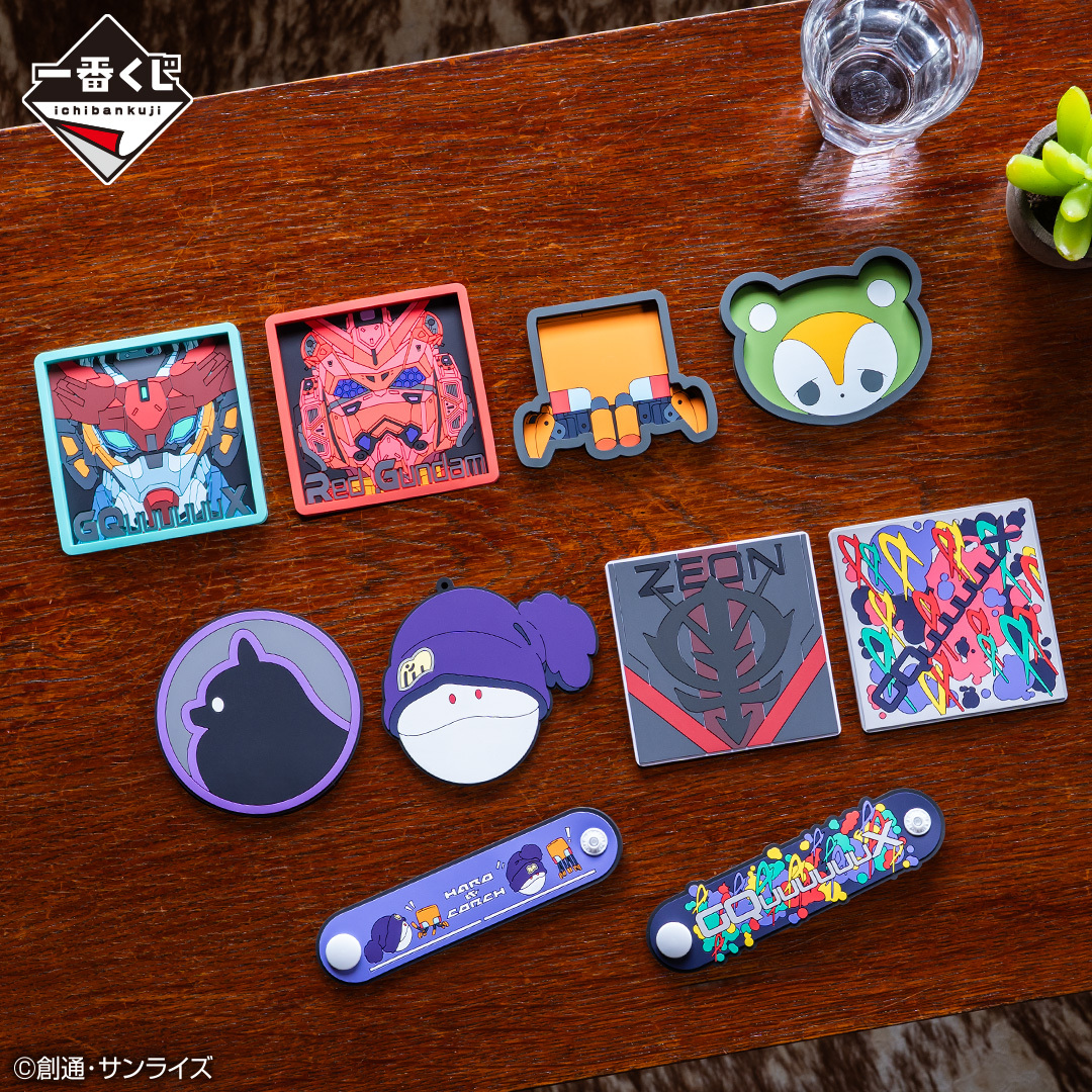 A賞は、主人公のマチュとハロが初めてGQuuuuuuXに搭乗するシーンを立体化しました。マチュの躍動感あふれる姿は必見です。B賞はマチュ&GQuuuuuuX、C賞はシャア&赤いガンダムのビジュアルスタンドをラインナップ。このほか、GQuuuuuuXが使うビームサーベルの持ち手をイメージしたマグカップ、クリア素材を活かしたデザインのアクリルチャーム、小物を入れられるトレイやコースター、コードクリップがラインナップされたラバーアソート、さまざまなキャラクターから選べる全6種のダイカットステッカーセットと、いずれも『機動戦士Gundam GQuuuuuuX』(ジークアクス)の魅力が凝縮されたアイテムです。