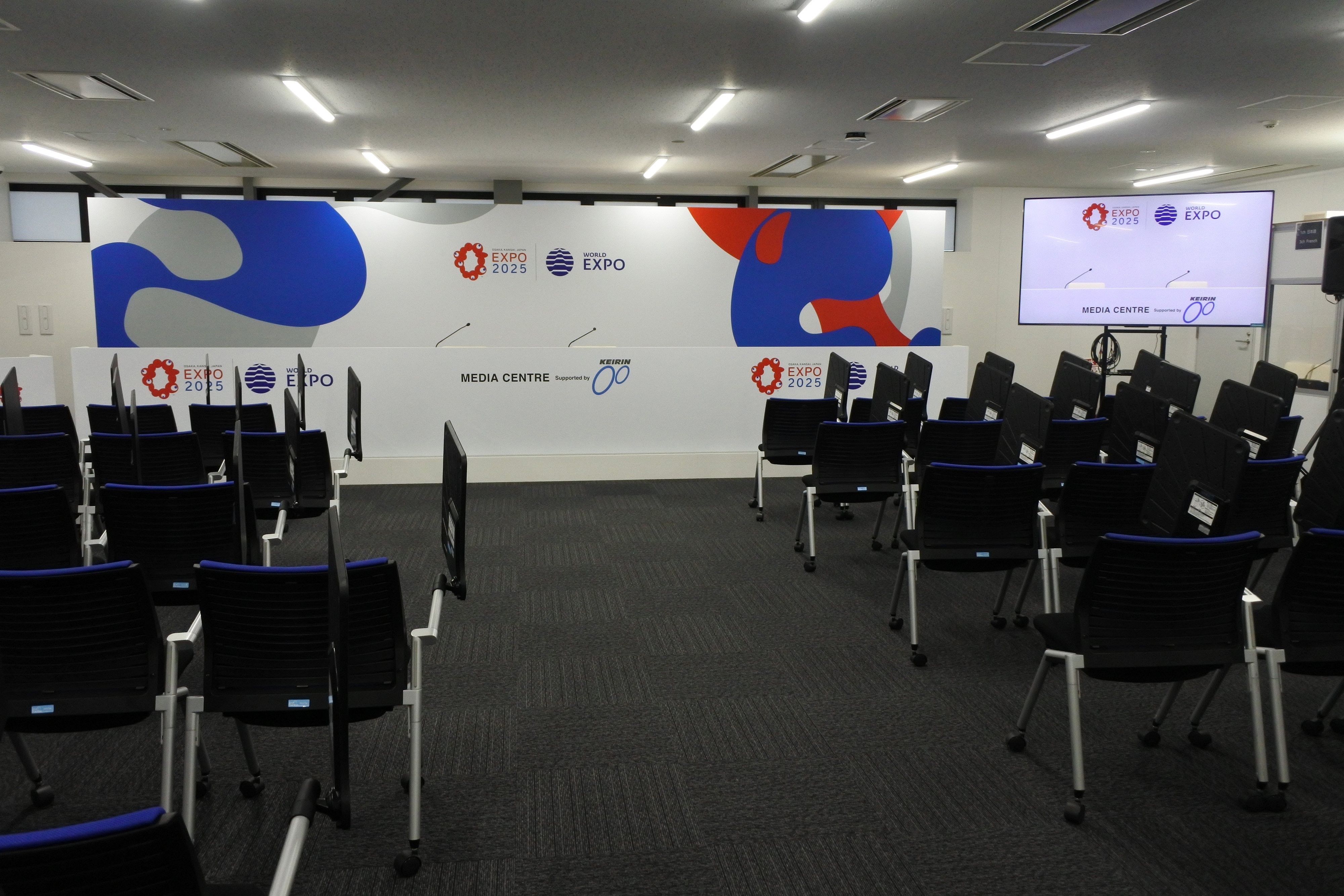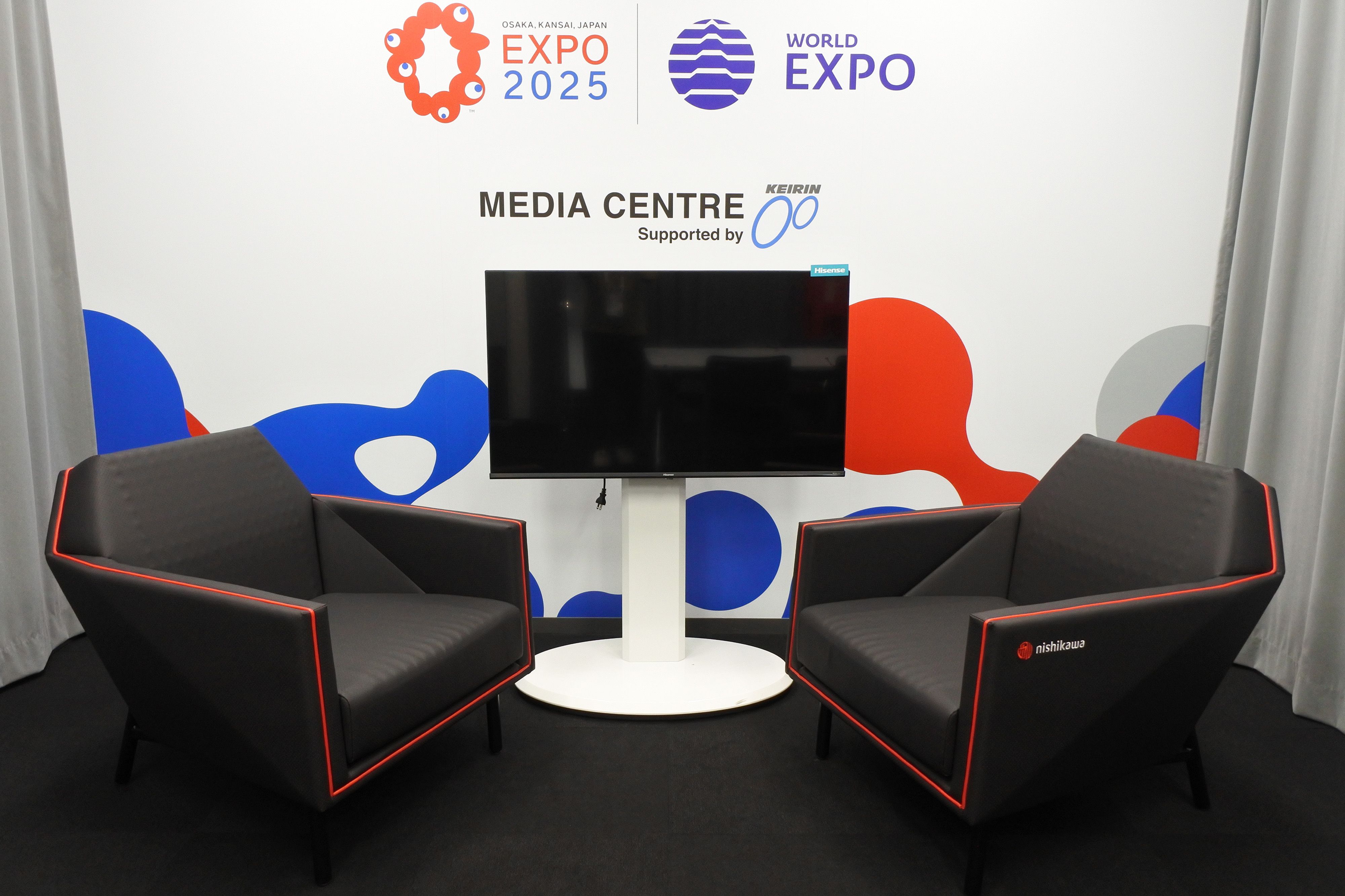 ハイセンス製大画面テレビは、大阪・関西万博における会場運営や情報発信を支える重要な拠点に導入されており、メディアセンターのインタビュールームや記者会見室などに設置しています。
