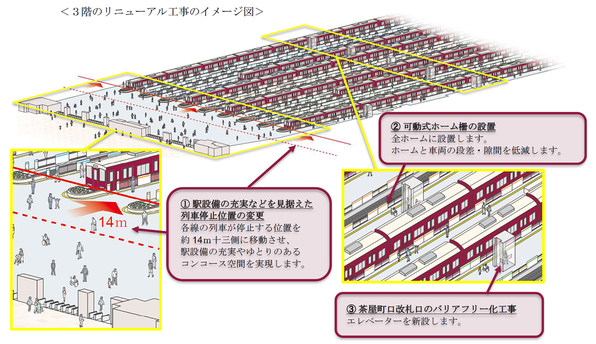 3階コンコース・ホームをリニューアルし、駅設備の充実やゆとりのあるコンコース空間を実現するため、各線の列車停止位置を約14m十三側に移動させます(車両1両は約19m)。