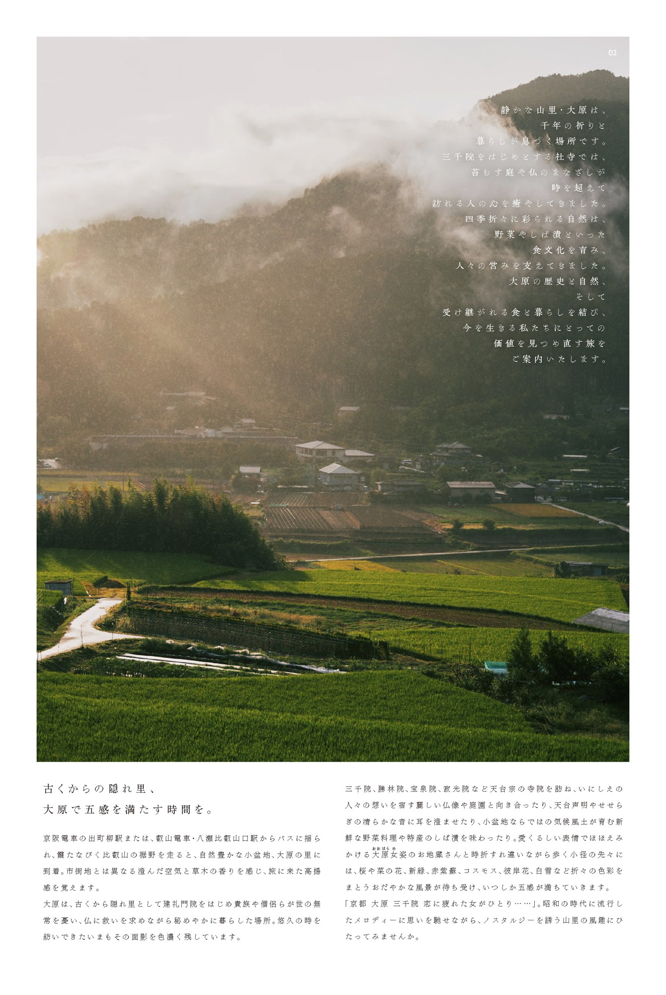 第1章では、「千年の祈り、静寂の里へ」と題し、千年の祈りと暮らしが息づく場所・大原の魅力をお伝えします。大原は京都市左京区に位置し、時を超えて人々の心を癒やしてきた三千院をはじめとする神社仏閣や、大原野菜・しば漬けといった食文化を育む四季折々の自然が存在する場所です。京阪電車 出町柳駅または叡山電車 八瀬比叡山口駅から京都バスで訪れることができます。