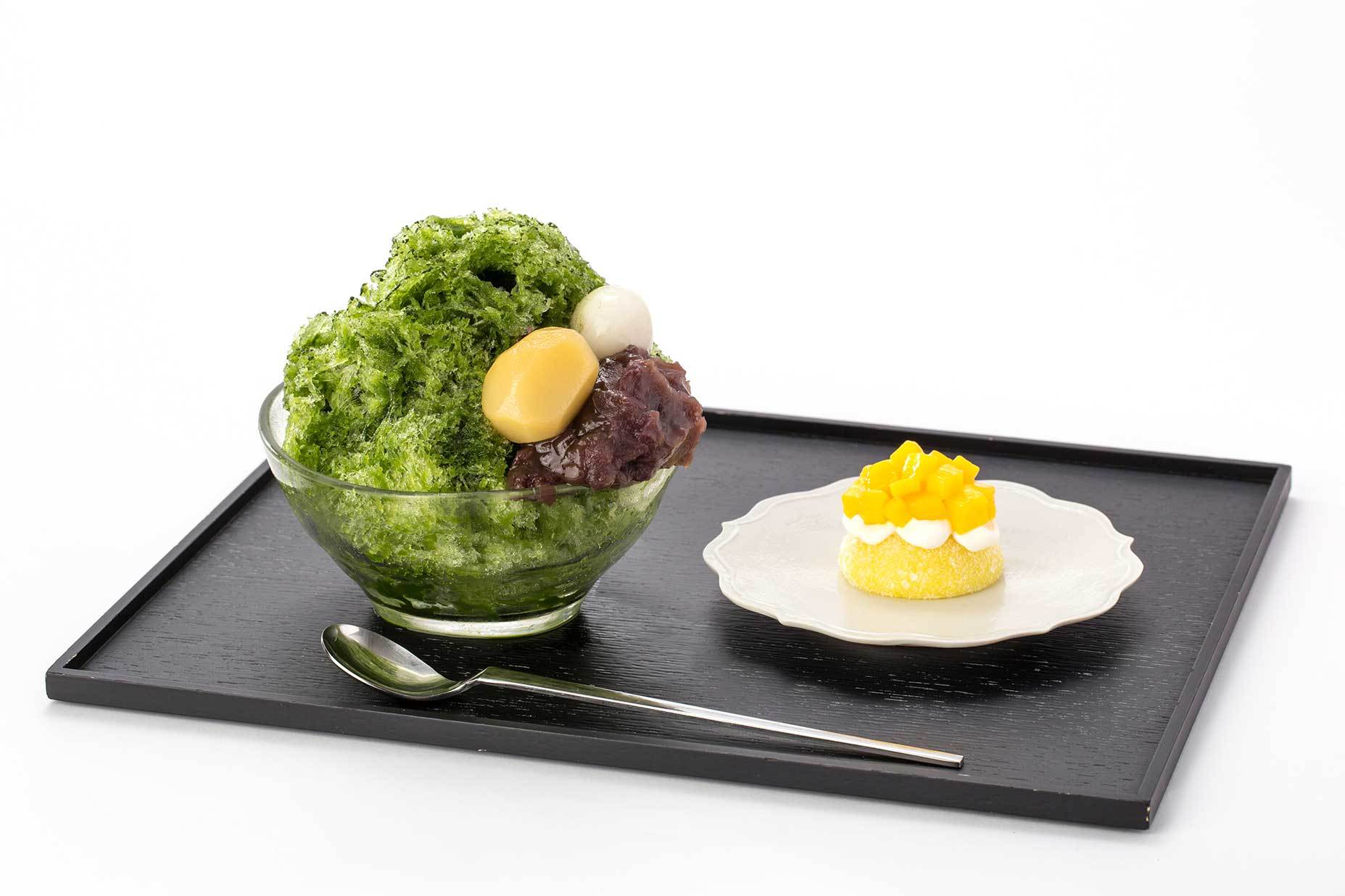 毎年人気のかき氷『宇治金時氷』と季節のフルーツ大福『マンゴー大福』の両方を味わえる『よくばりセット』は、今年の新メニューです。