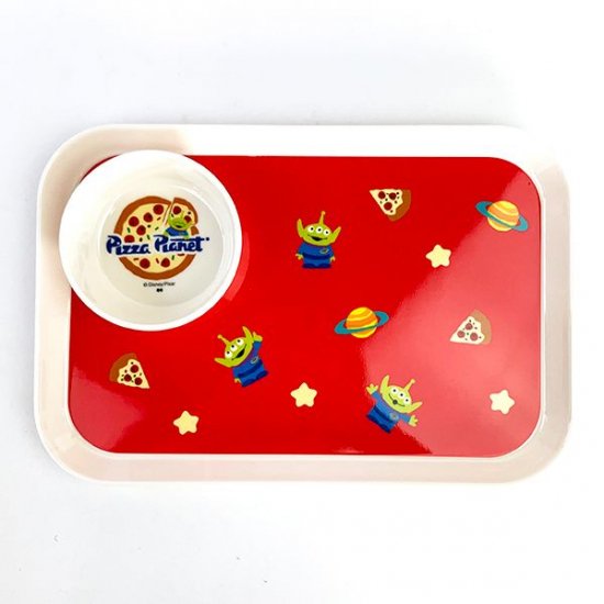 エイリアンのピザデザインも!ピザに惑星にチーズの星?が散らばった元気になりそうなデザイン。ボウルにはピザと一緒にすやすや眠るエイリアンが!