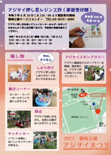 篠崎公園のビュースポットであるアジサイ園と令和7年4月にオープンした新遊具広場で、アジサイの見頃に合わせて、「アジサイまつり」を開催します。