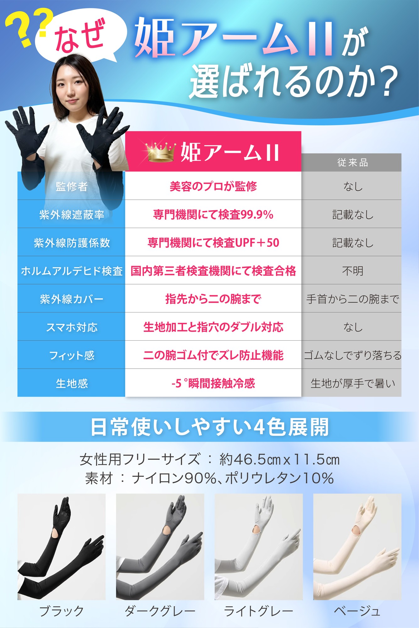 最長約56cmのロング丈で、無防備になりがちな指先から二の腕までを完全カバー。