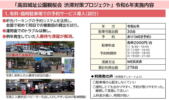 高田城址公園観桜会は車での来場者が多く、例年、会場周辺の駐車場が不足し、駐車場入口での入庫待ち車両の滞留や、会場周辺の交通混雑が発生しており、課題の解決に向け、令和6年2月に高田城址公園観桜会事務局と高田河川国道事務所、軒先株式会社が連携して始動したプロジェクトです。