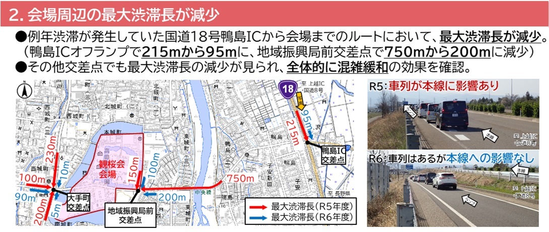 駐車場料金の設定調整を行った結果、第1臨時駐車場の利用台数が減少したことで付近の混雑が緩和され、昨年の第2臨時駐車場は入庫待ちが多数あり付近が混雑していましたが、予約制にしたことで駐車場への入庫待ちが無くなり付近の混雑が緩和されました。