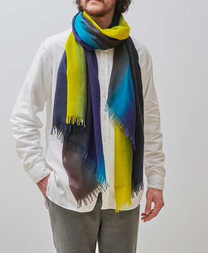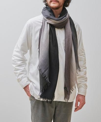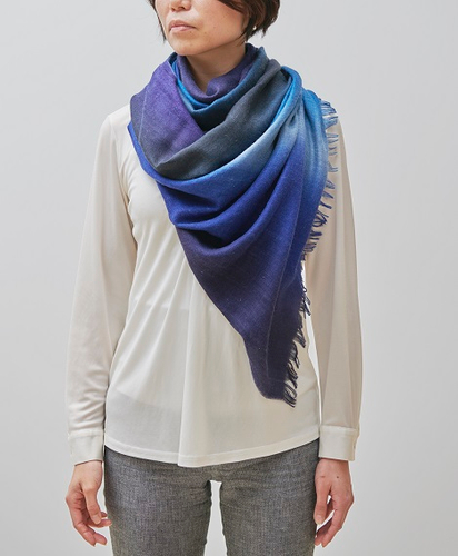 最高品質のシルクとカシミヤを極細糸にし、山梨・富士北麓の工房にてゆっくりと織られた生地。素材の風合いを引き出しシルクの光沢とカシミヤの温かさを楽しめます。年間を通じてお使いいただける素材です。京都の職人の手染めにより自然に溶け込むものへの共感、日本の美意識をグラデーションで表現しました。