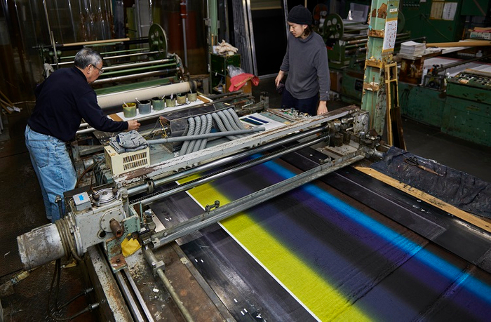 染めの工程は、京都で行われます。若手の職人とベテランがタッグを組み、背中を見ながら技術を覚える光景が、工房のあちらこちらで見ることができます。人の手が関わっているから実現できる表現がここにあります。