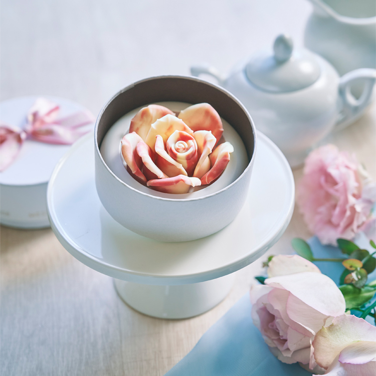 マーブル模様の花びらを重ね、美しく凛とした薔薇の品種“ソニア”を、チョコレートで再現しました。