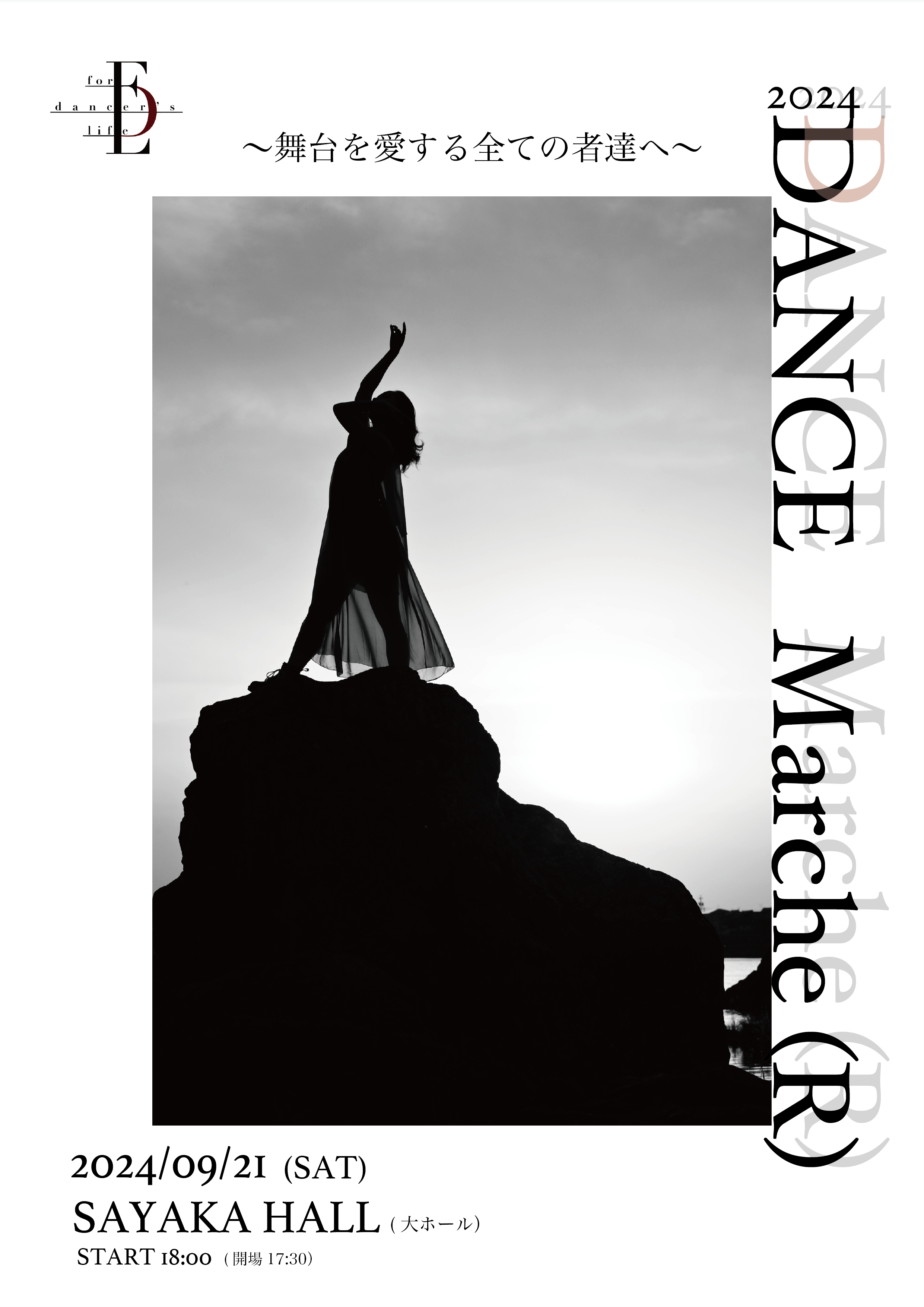 踊りの市場、踊りを提供する人、踊りを探しに来る人、踊りを見る人が集う場所。そして(R)をつけることで同じマルシェでも、「歩む」という意味になります。踊りと舞台と共に人生を歩む者たち。DANCE Marche(R)が多くの人で賑わうことを願っています。