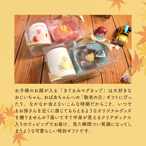お子様のお顔、お名前が入る「きぐるみマグカップ」とスイーツ、紅茶がセットになった敬老の日特別ギフトセットをご用意致しました。