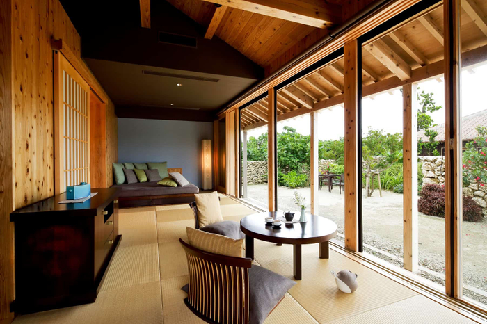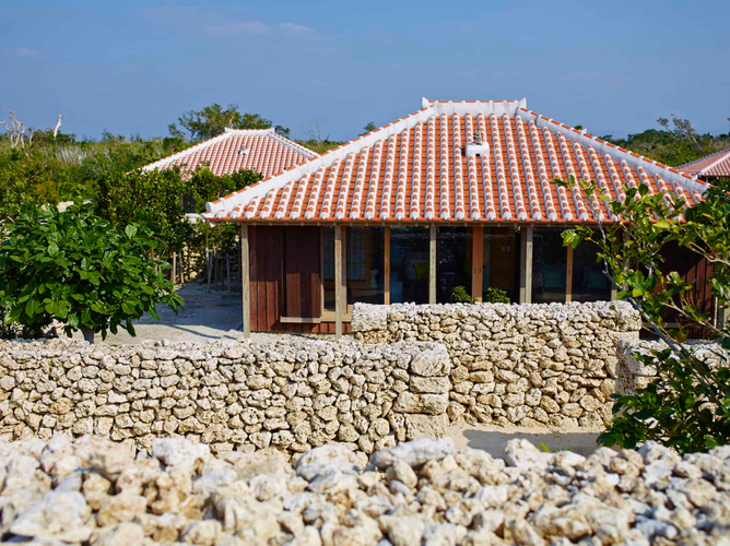 星のや竹富島の全客室48棟は島の伝統建築基準に則って築かれており、島の集落同様にすべて南向きに造られています。「幸せを運ぶ」とされる南風(ぱいかじ)を取り込める大きな窓を南側に配し、外と中が緩やかに繋がるように設計しました。北側の窓を開ければ南風が通り抜け、鳥の声や木々のそよぐ音など豊かな自然を感じられるつくりです。客室内だけでなく建物を囲うグック(石垣)も伝統建築を踏襲しています。グックは島の地面を掘り起こす際に出てくる大小さまざまな形の琉球石灰岩が積み上げられたものです。島では「みんないかす」の精神のもと、それぞれの岩の形をいかして造ります。施設のグックも職人が一つひとつ手作業で積み上げ、まるで島の風景の一部であるかのような景観を生み出しています。星のや竹富島の客室は訪れる方々に「島の自然の心地よさを体験してもらいたい」という思いが詰まった空間です。