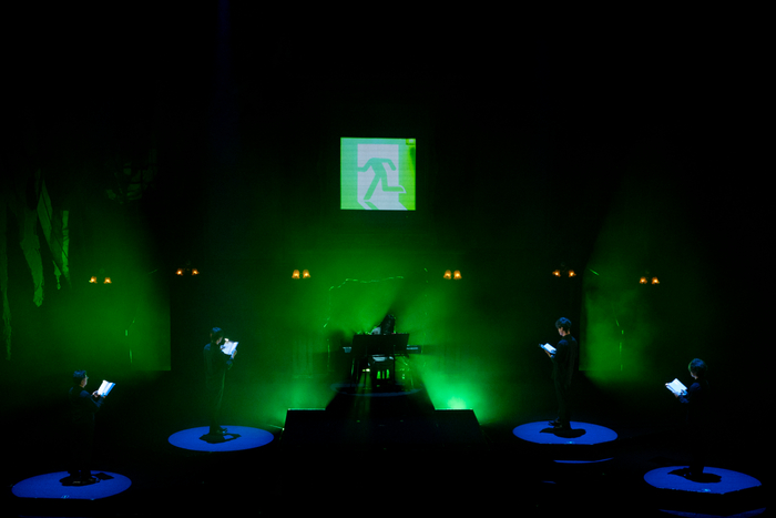 ステージ上には洋館のようなセットが組まれ、美しいが不気味なBGMが流れており雰囲気たっぷり。開演時間になると照明が落ち、呼吸や呻き声のような音が場内に響く。キャストが登場すると、「怖い話をしているとなにかが寄ってくる」と話しながら今回の公演について語り始める。ピアノの生演奏や客席を巻き込んだ演出に、客席全体がひんやりとした空気に包まれる中、公演がスタートした。