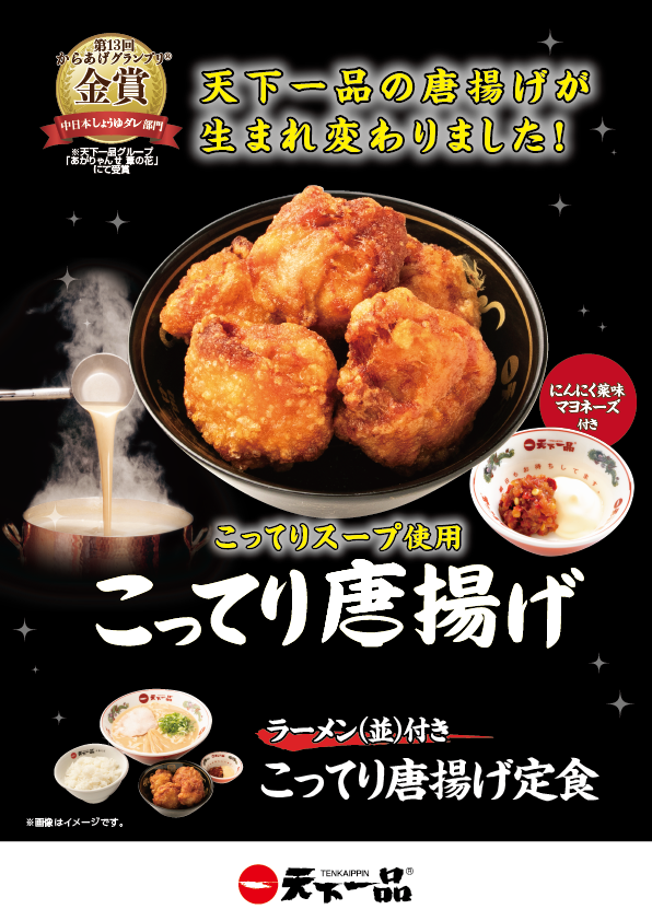 京都北白川発祥、鶏がらや野菜なども用いたこってりスープが人気の中華そば専門チェーン店「天下一品」(本社:滋賀県大津市、グループ累計226店舗を展開中※)は、10月11日(火)より15店舗にて先行販売を実施し開始し、大変ご好評いただきました新商品の唐揚げ「こってり唐揚げ」を11月4日(金)より全国の店舗にて販売いたします。