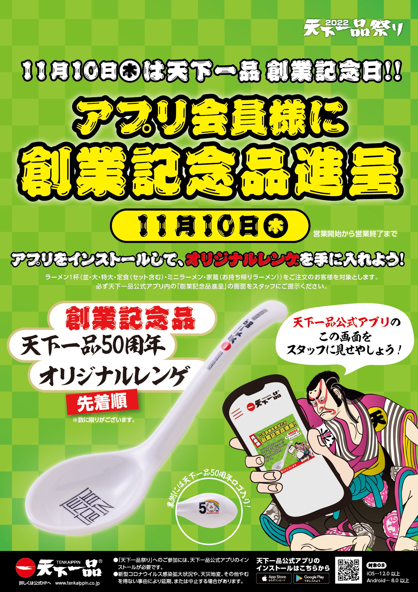 また、11月10日(木)の天下一品創業記念日では、アプリ会員様限定で創業記念品として「天下一品50周年オリジナルレンゲ」を進呈いたします。